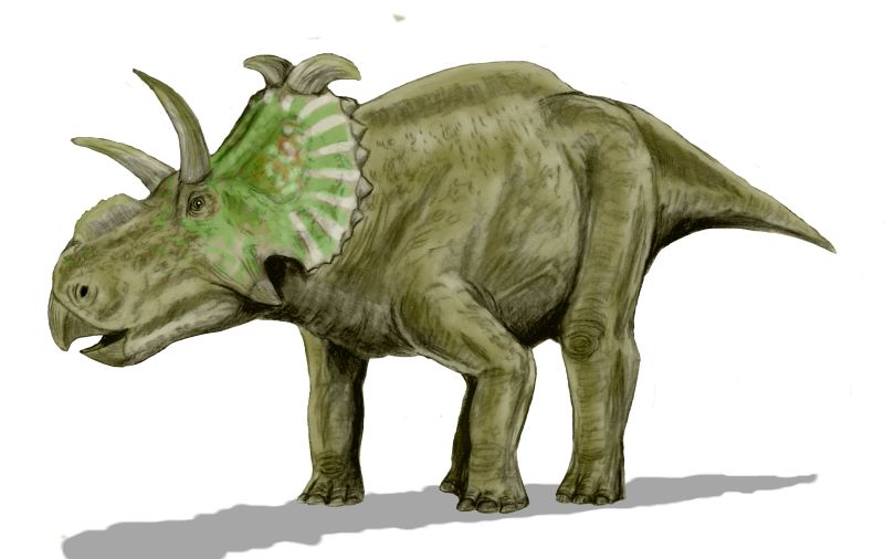 Albertaceratops is known from a single complete skull (TMP.2001.26.1) found in August 2001 and skull and postcranial fragments. This genus is unusual in combining long brow horns with an otherwise centrosaurine skull, as centrosaurines normally possess short brow horns. Over its nose was a bony ridge, and on its frill were two large outwardly-projecting hooks. A phylogenetic analysis carried out by its describer, Michael J. Ryan, found it to be the most basal centrosaurine.[1] Additional specimens were reported from a bonebed in the Judith River Formation of Montana, which is equivalent to the Oldman Formation and differentiated only by the United States/Canadian border. However, further study showed these remains to come from a chasmosaurine, Medusaceratops. Both ceratopsids lived during the same time period, about 77.5 million years ago.[2]