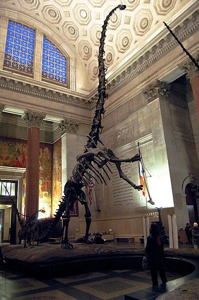- Apatosaurus (Brontosaurus): This giant specimen was discovered at the end of the 19th century. Although most of its fossil bones are original, the skull is not, since none was found on site. It was only many years later that the first Apatosaurus skull was discovered and so a plaster cast of that skull was made and placed on the Museum's mount. A Camarasaurus skull had been used mistakenly until a correct skull was found.[53]
