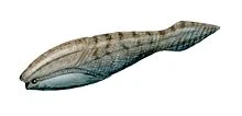 Arandaspis was about 15cm (6 in) long, with a stream-lined body covered in rows of knobbly armoured scutes. The front of the body and the head were protected by hard plates with openings for the eyes, nostrils and gills. Although it had no jaws, Arandaspis might have had some moveable plates in its mouth, serving as lips, sucking in food particles. The low position of its mouth suggests Arandaspis foraged the ocean floor. It had no fins; its only method of propulsion was its horizontally flattened tail. As a result, it probably swam in a fashion similar to a modern tadpole.[1]
