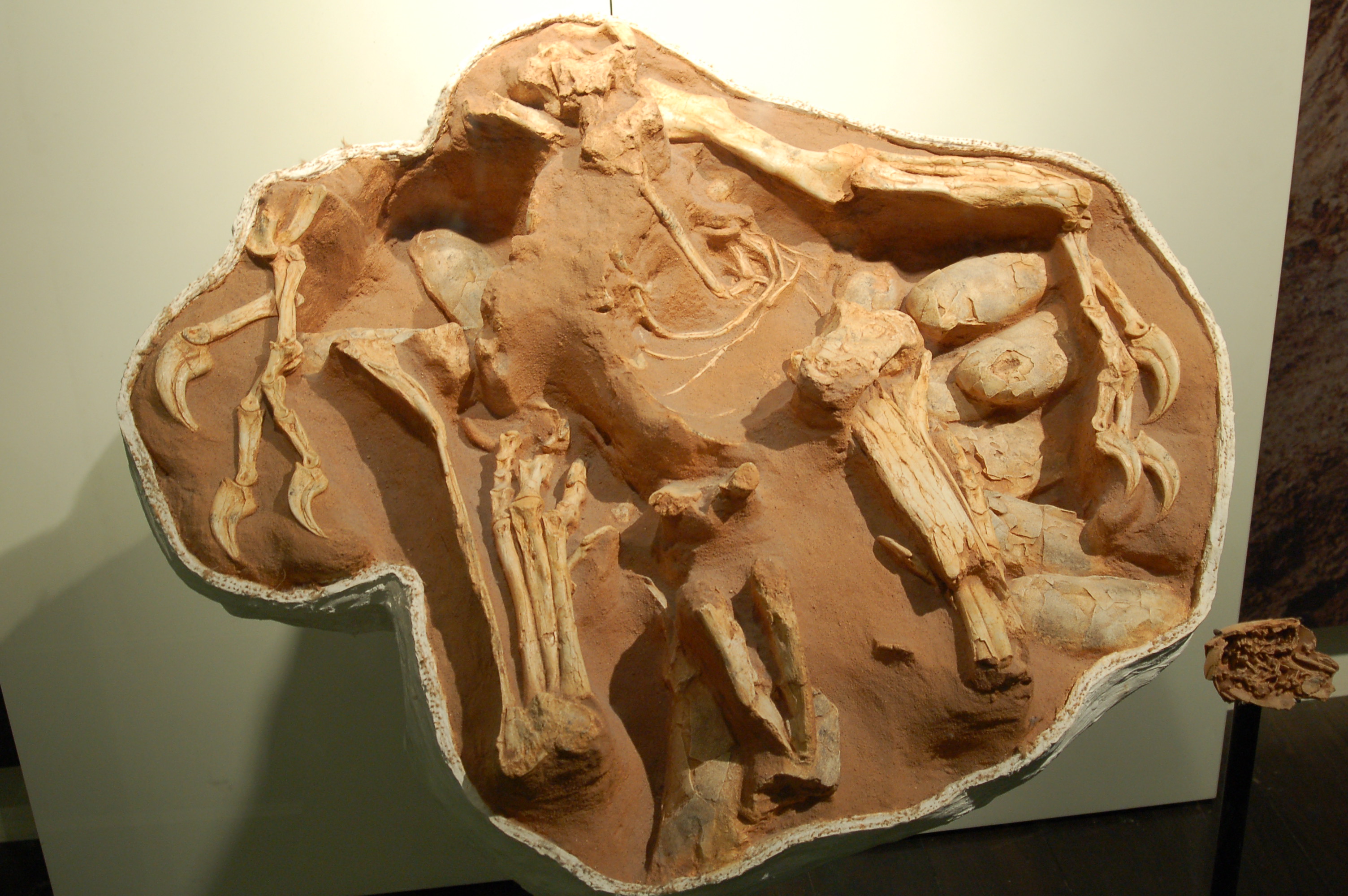A nesting Citipati osmolskae specimen, at the American Museum of Natural History in New York.