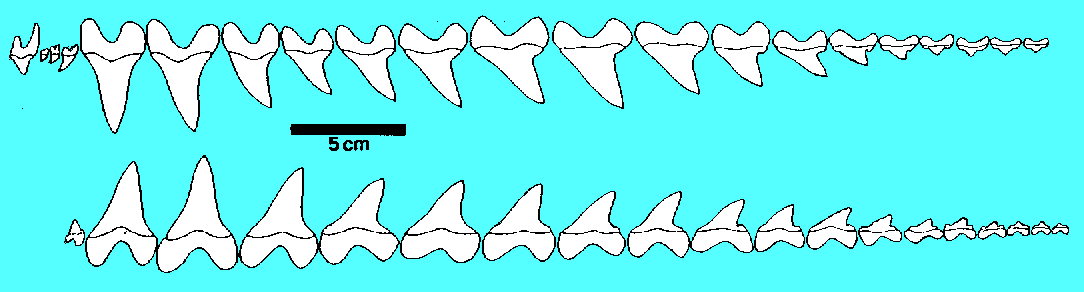 This drawing (adapted from Shimada, 1994) shows the arrangement of teeth in the upper and lower jaws of Cretoxyrhina mantelli. The front of the jaw is to the left. This shark had a total of about 80 teeth at the gum line. Each of these teeth had as many as 7 replacement teeth in various stages of growth on the inside of the jaws.