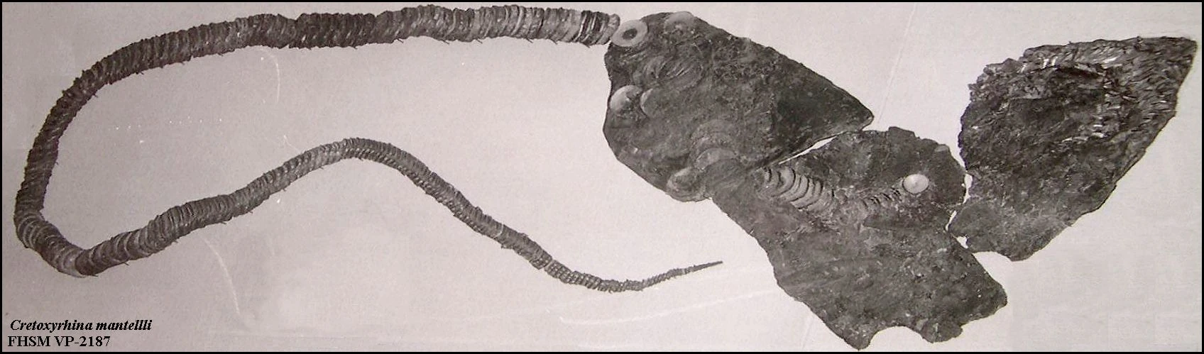 Most Cretaceous sharks are known primarily from isolated fossilized teeth. In contrast, several nearly complete skeletons of C. mantelli have been discovered. These astonishing fossil finds include disarticulated clusters of vertebrae with associated upper and lower tooth sets lying in clear arcs, giving a vivid impression of Cretoxyrhina's body length and mouth width.