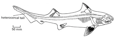 Hybodontiformes were characterized by paired fins that show signs of intrinsic musculature, and greater flexibility, implying that they were used in steering. They had a heterocercal tail, an anal fin and amphistylic jaw suspension. Hybodonts were also the first group to possess a heterodont dentition (different shaped teeth along the length of the jaw). For instance, having sharp cutting teeth in the front part of their jaw and flat crushing teeth in the back part of the jaw allowed them to feed on a variety of food types. The Hybodontiformes also possessed a full set of hemal, as well as neural, arches around the notochord.
