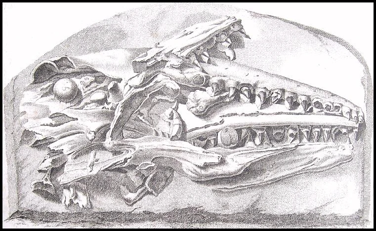 The Mosasaurus discovered in a Maastricht limestone quarry, 1786 (contemporary engraving)
