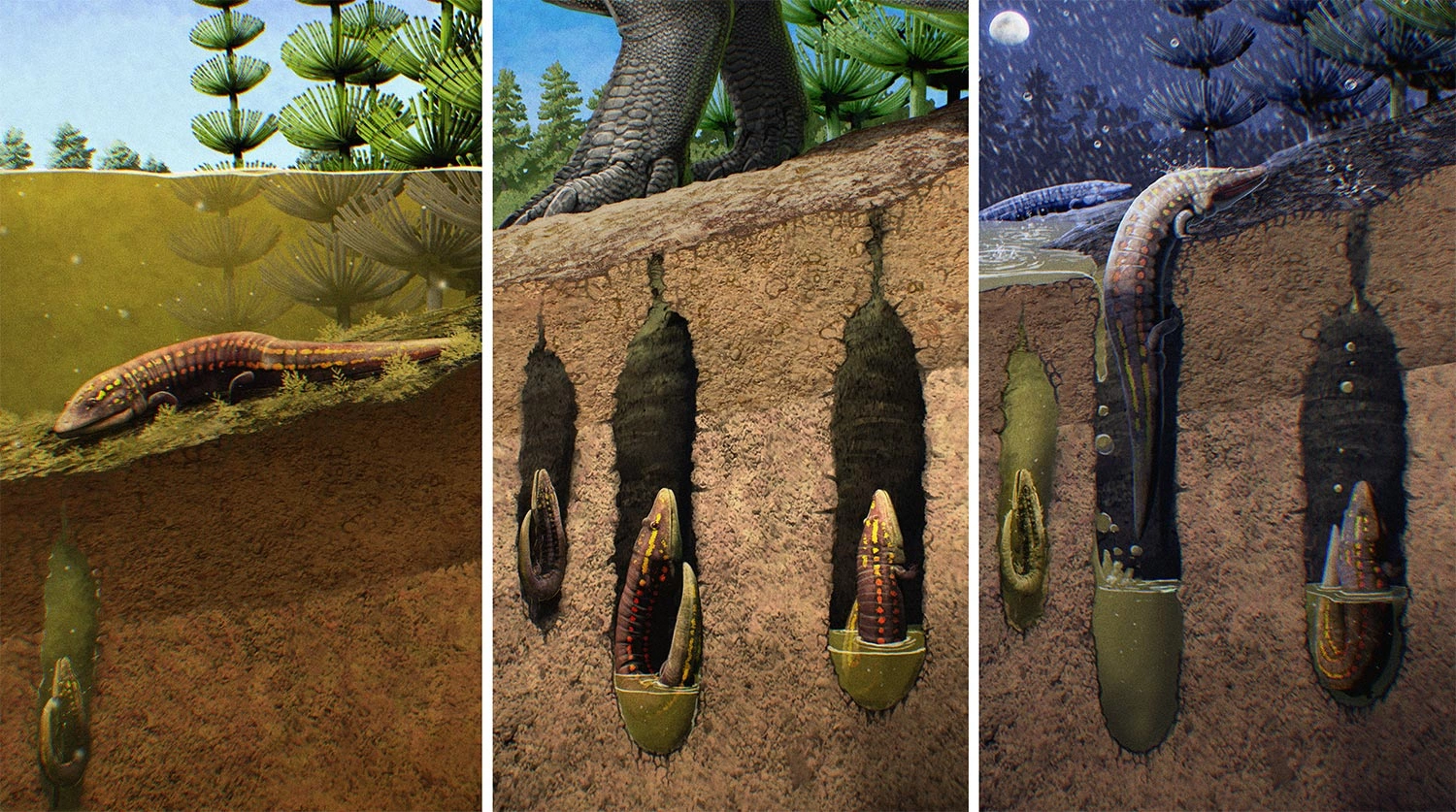 Triptych showing Ninumbeehan in its palaeoenvironment across seasons. First:Ninumbeehan resting on the edge of a river with a low water table as the rainy season ends. Second: A small community of Ninumbeehan in their estivation burrows during the peak of the arid season. Third: The beginning of the rainy season triggering a mass emergence from their estivation burrows (some individuals would not have made it through the estivation period and would have died in their burrows)