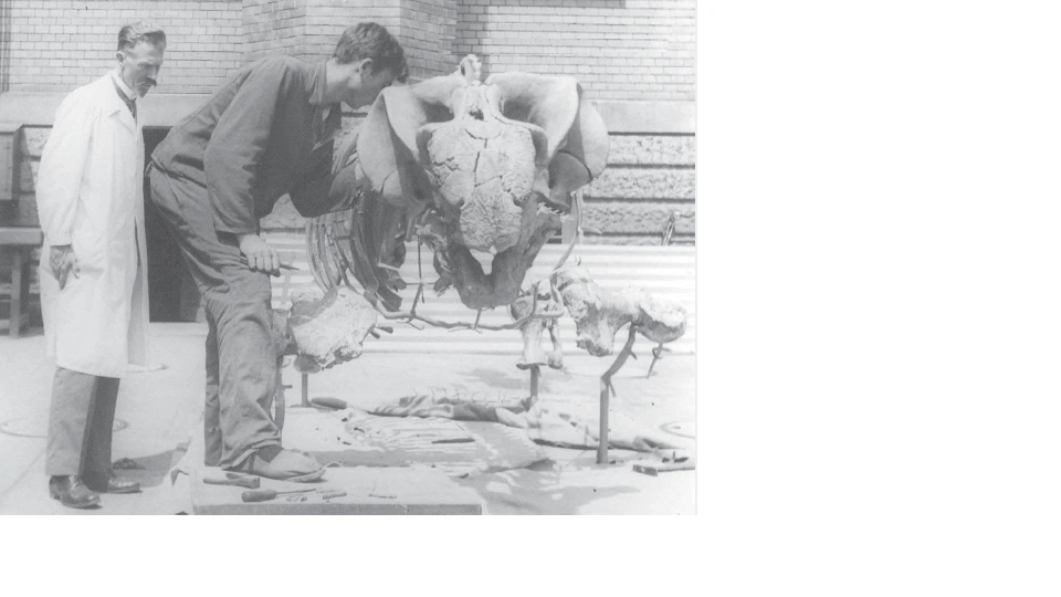 Friedrich von Huene (left) with a Stahleckeria dicynodont skeleton at University of Tübingen.