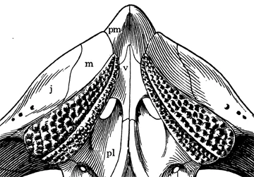 The palatal surface of Hyperodapedon (from Chatterjee 1974). The multiple maxillary tooth rows are clearly visible. There is also a groove extending along the length of the maxilla as well. pm = premaxilla, m = maxilla, j = jugal, v= vomer, pl = palatine.