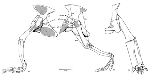 The hindlimb bones are thin anteroposteriorly, but broad mediolaterally. Large attachment areas were available for well developed flexors and extensors of the foot. Combined with the near-parasagittal (parasagittal = parallel to the long axis of the body) movement of the femur, this shows that the long, strongly clawed feet could have functioned well in digging.