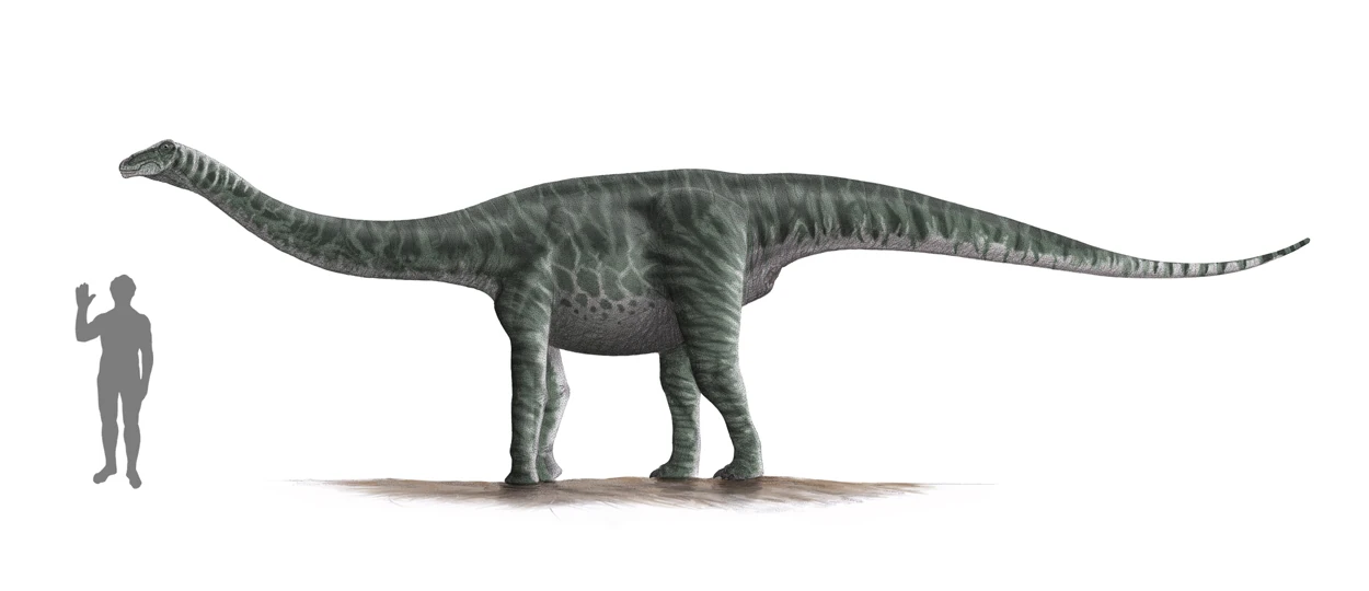 Like all sauropods, Rinconsaurus was a large long-necked quadrupedal animal, with a long, whip-like tail and four pillar-like legs. Rinconsaurus was an unusually slender sauropod. Although fossil discoveries are incomplete, and no complete necks or heads have been found, fully grown Rinconsaurus are estimated to have been 11 meters (36 ft) long and approximately 2.5 meters (8 ft) high at the shoulder.[1] Though only a portion of one skull has been recovered, Rinconsaurus may have had a long, narrow skull, based on fossil evidence of the skulls of related titanosaurs.